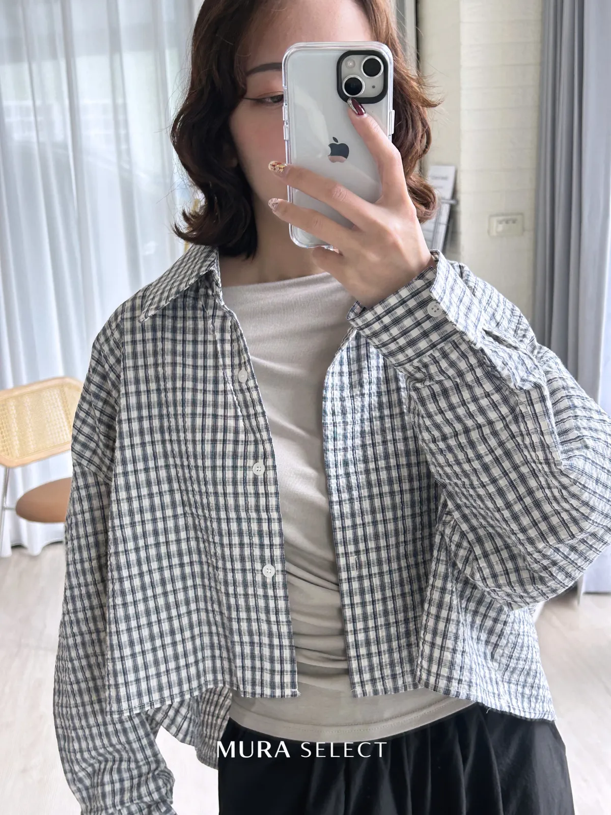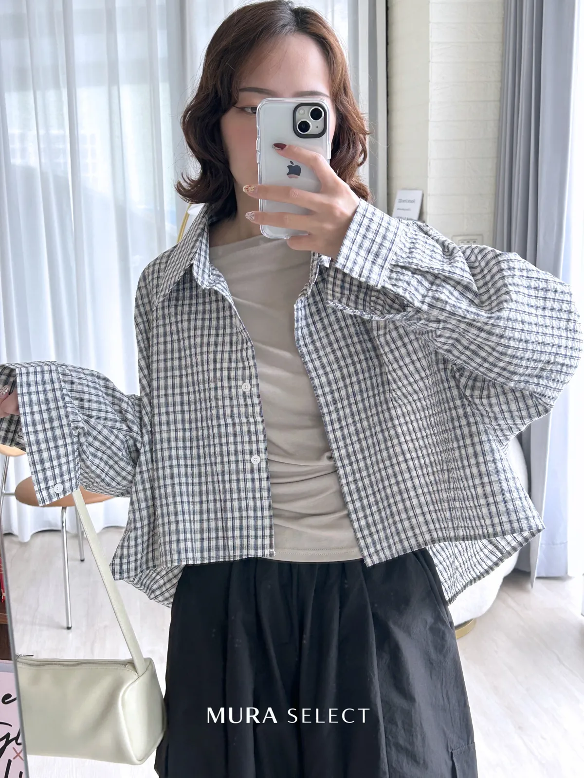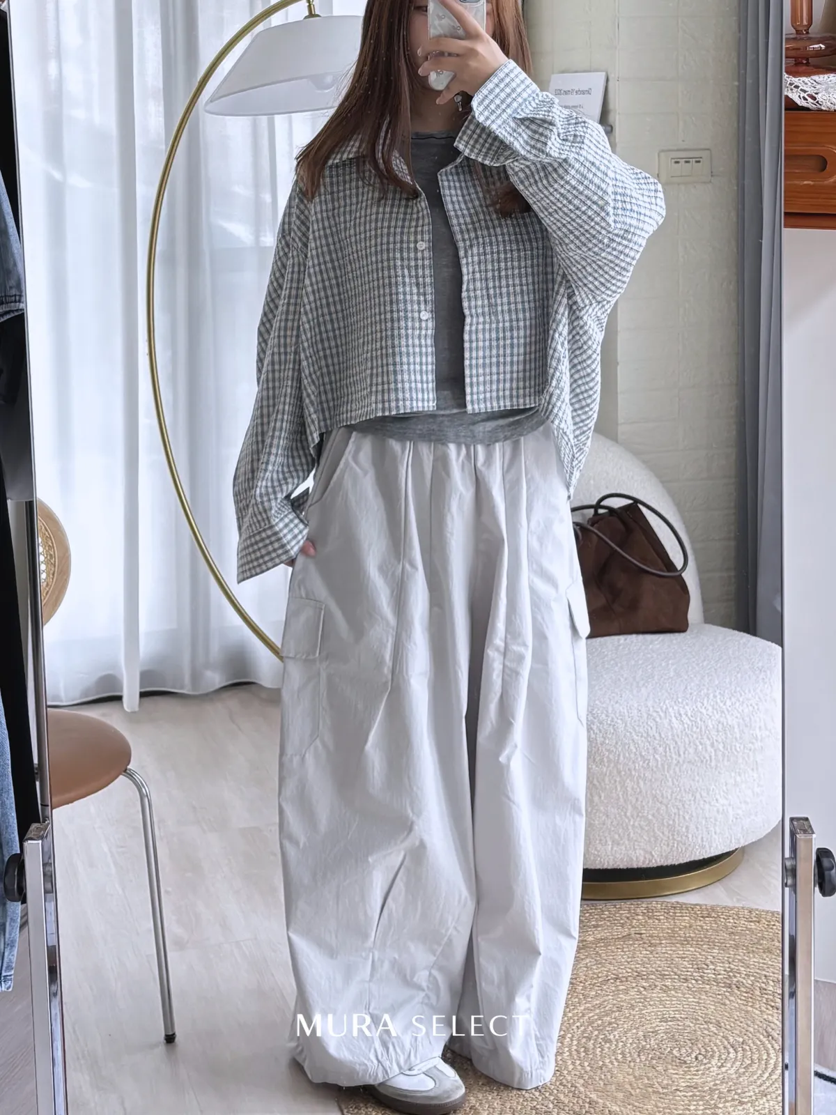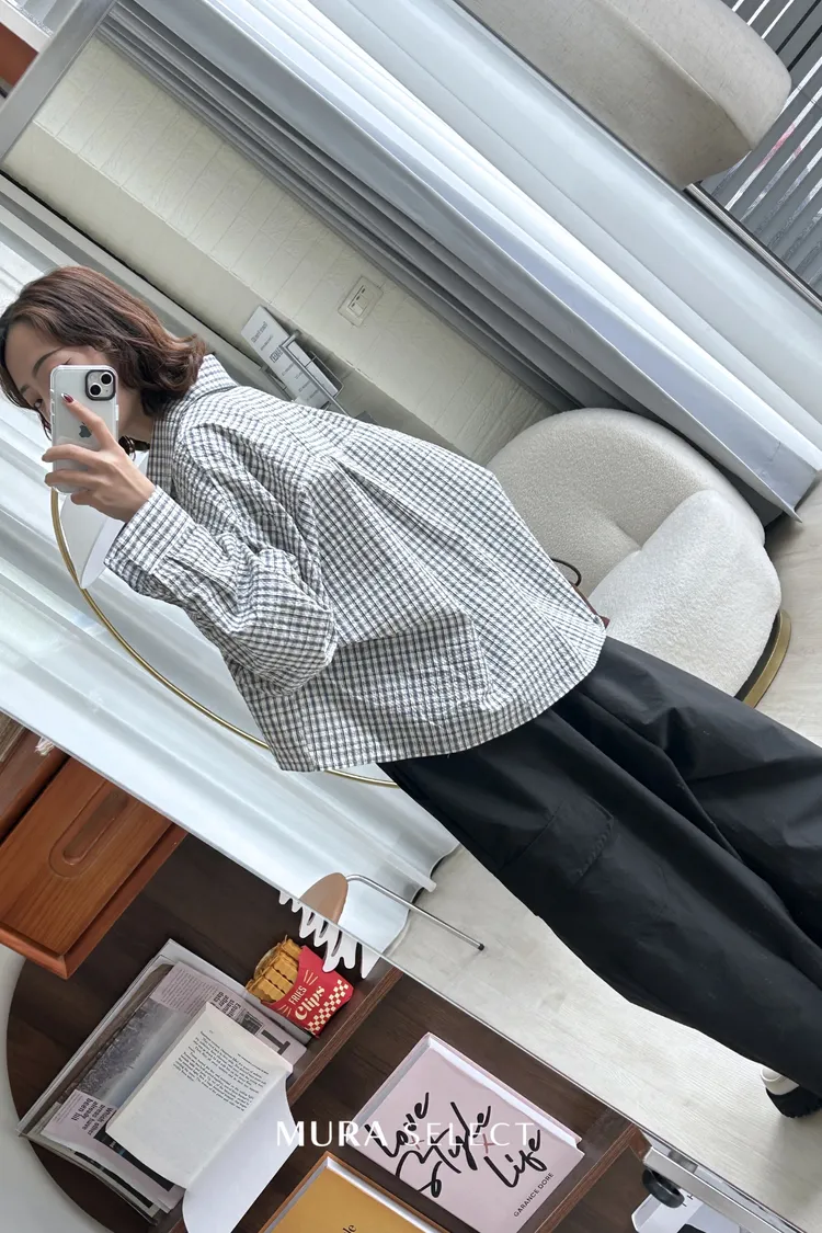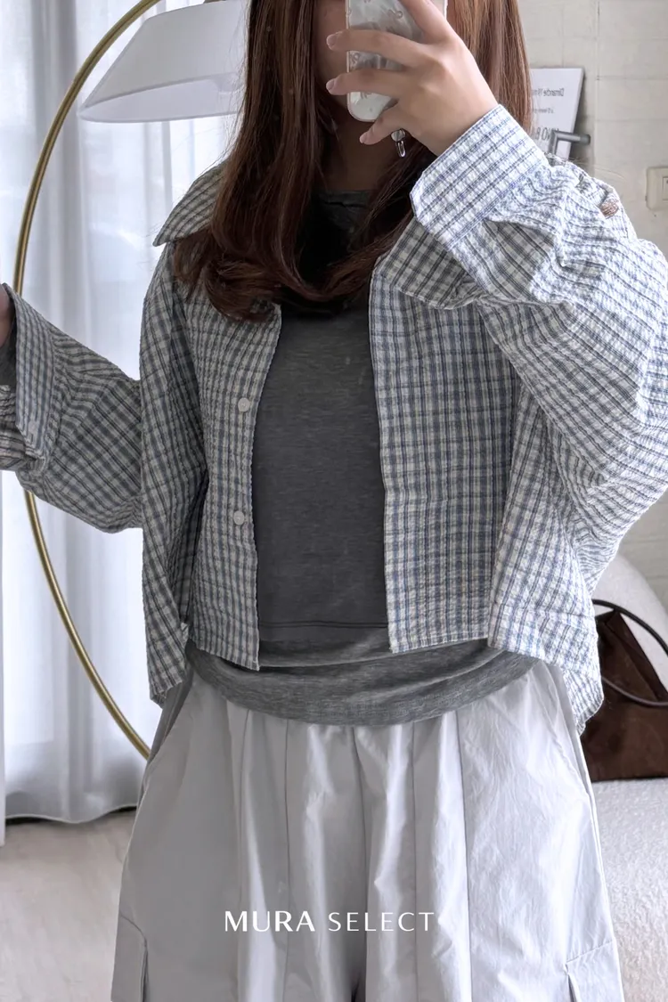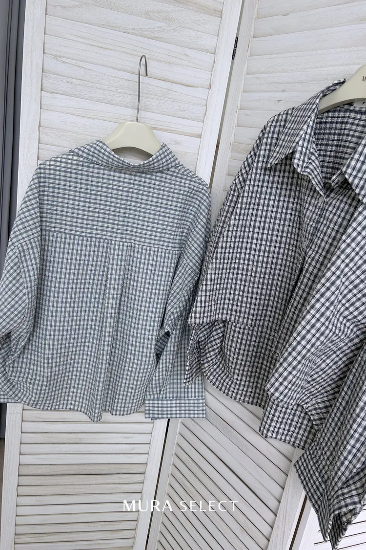 好好看 寬鬆弧型泡泡格紋襯衫2colors