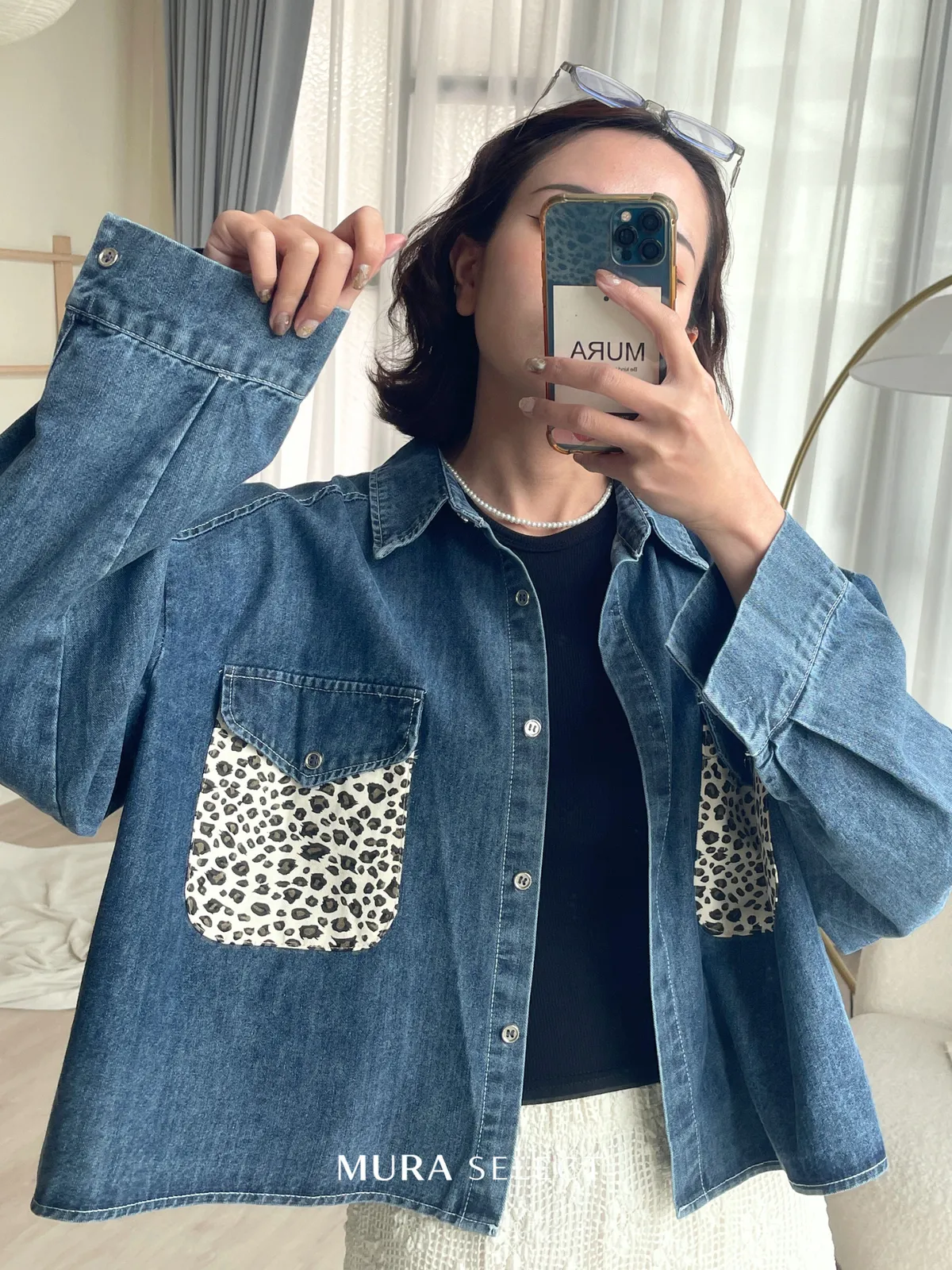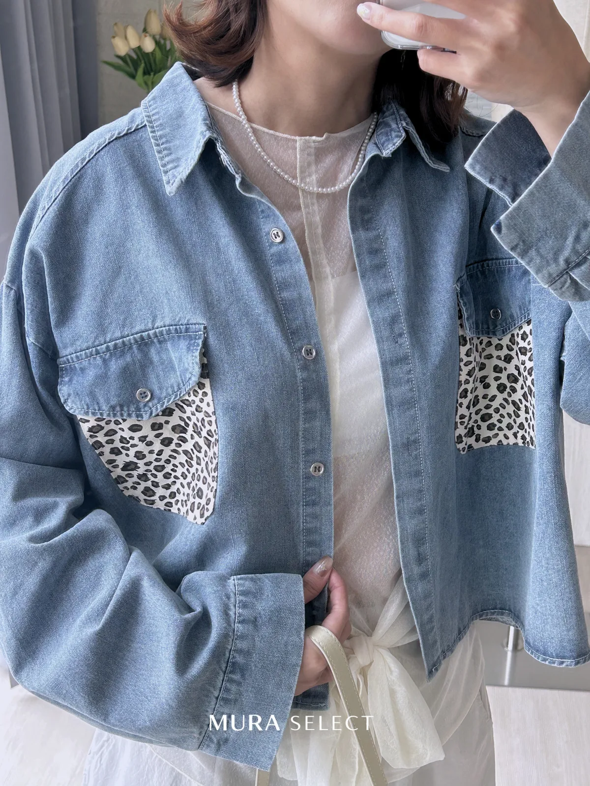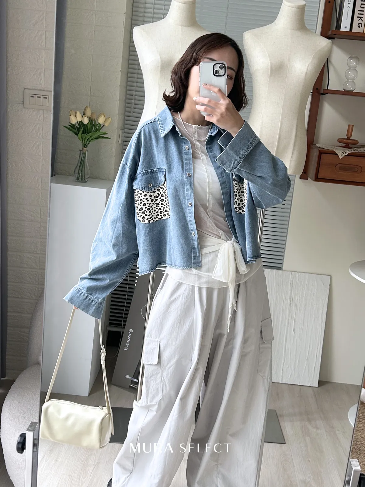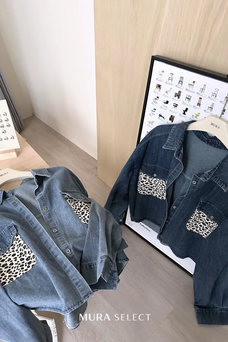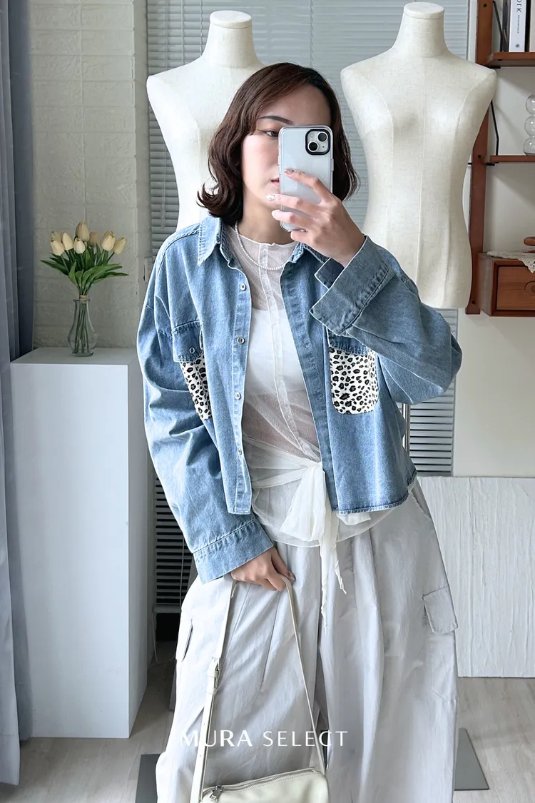 酷甜可愛 乳牛豹紋口袋牛仔襯衫2colors