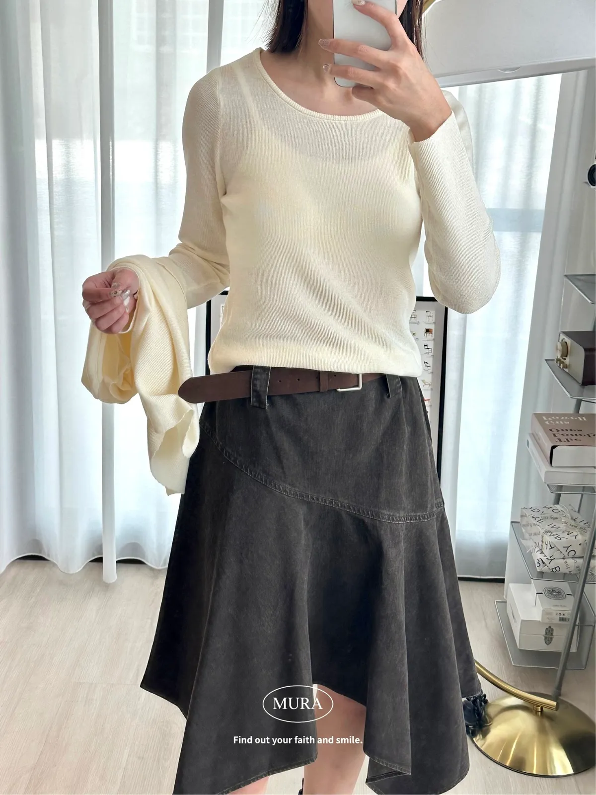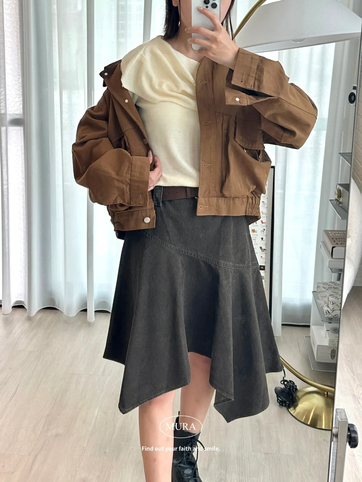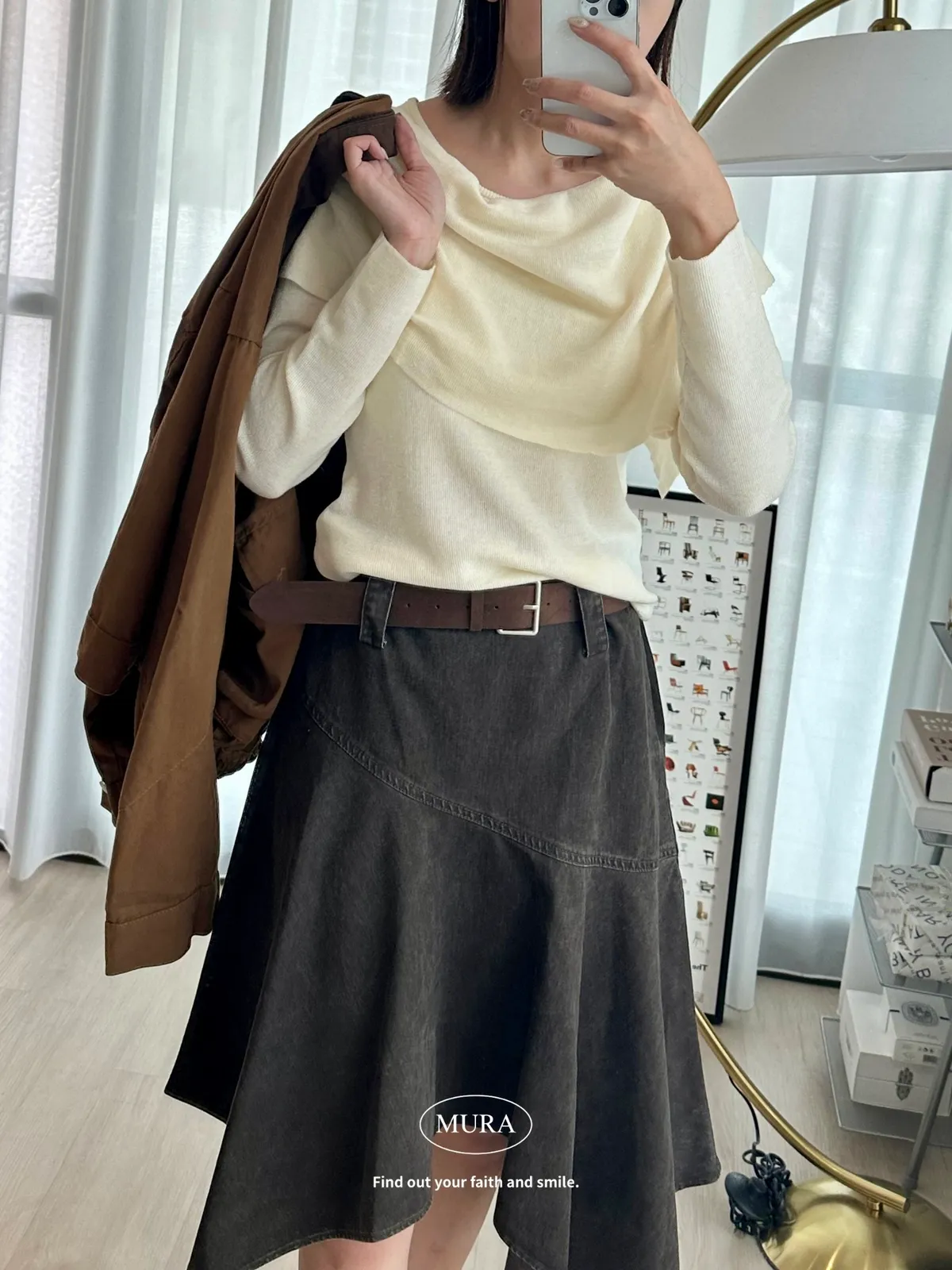 這款不規則裙採用霧感水洗面料,呈現自然霧潤質感,