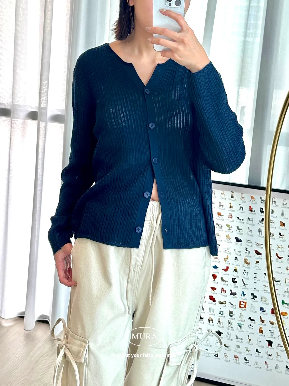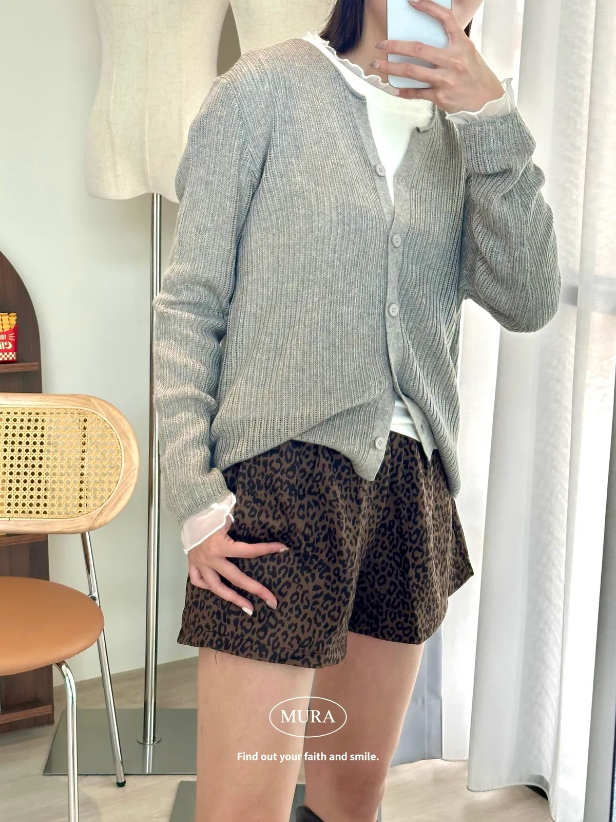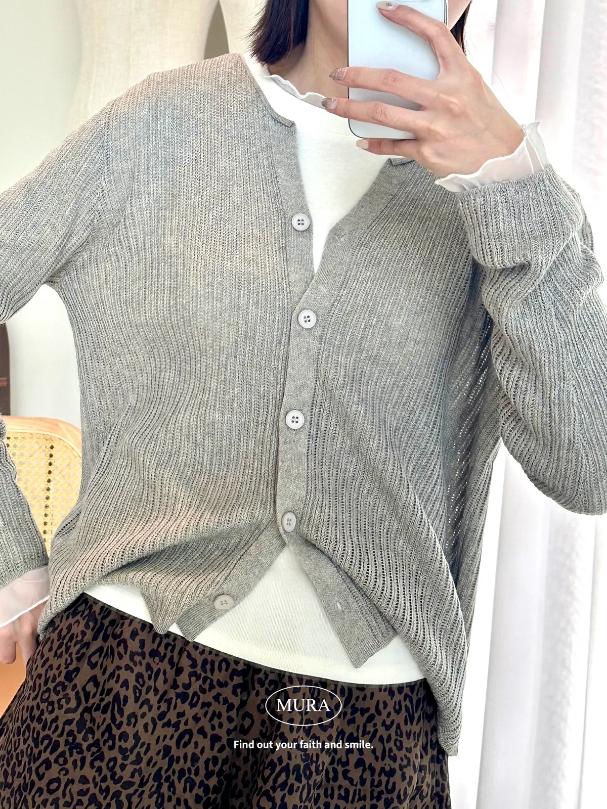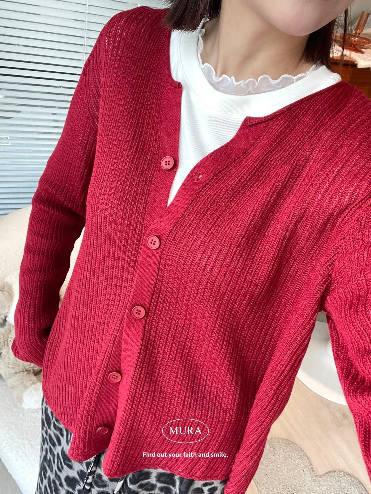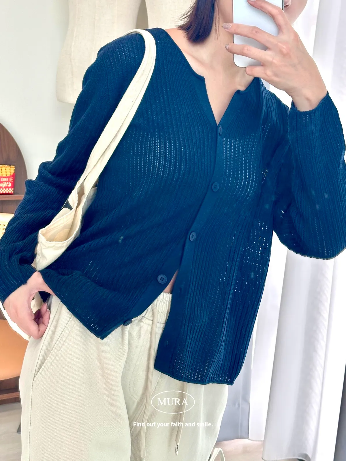開釦針織外套的小V領剪裁修飾頸部線條,穿上自然散發慵懶氛圍。