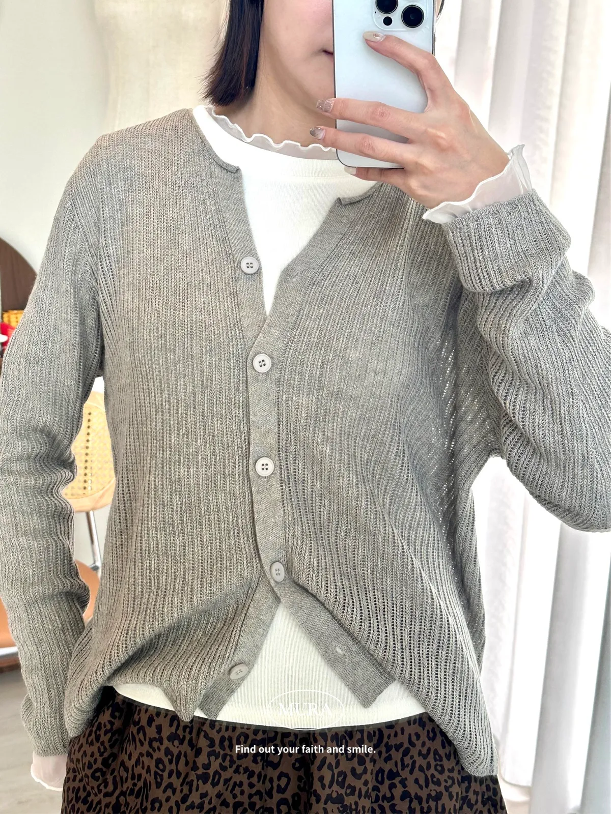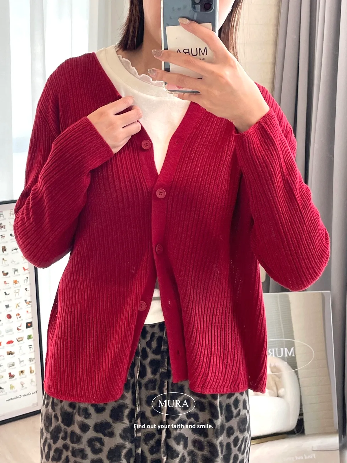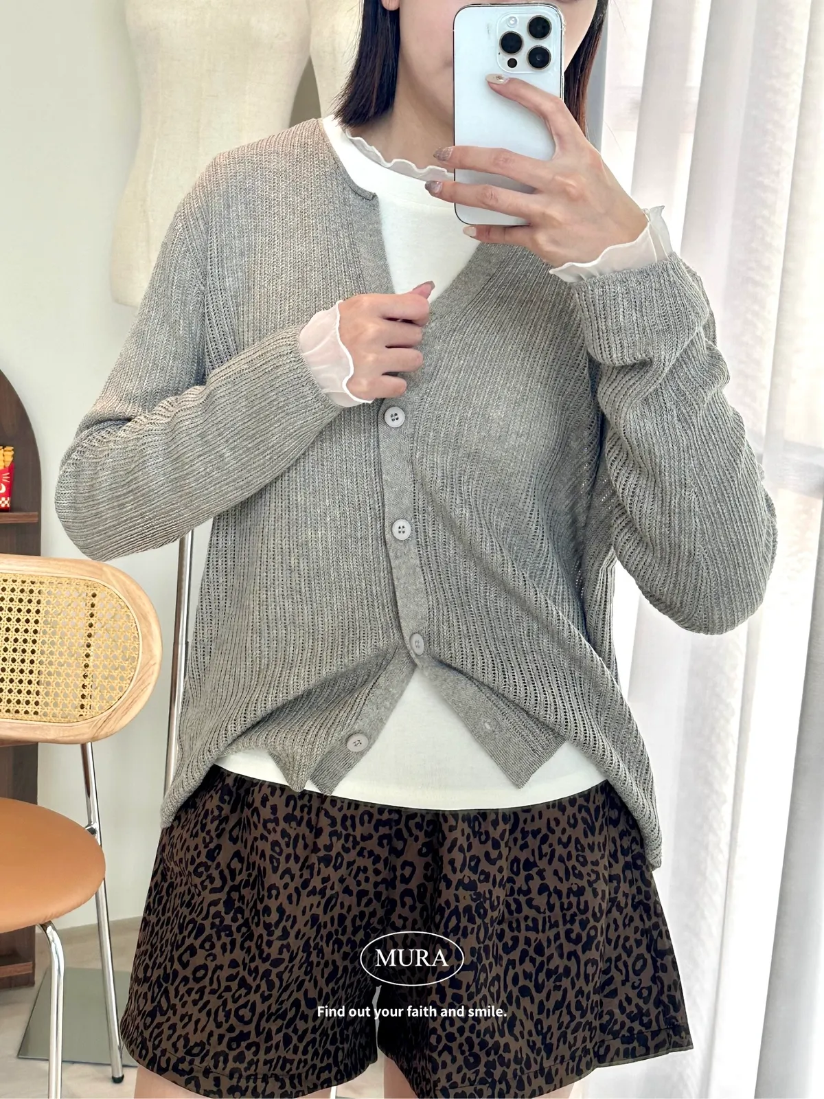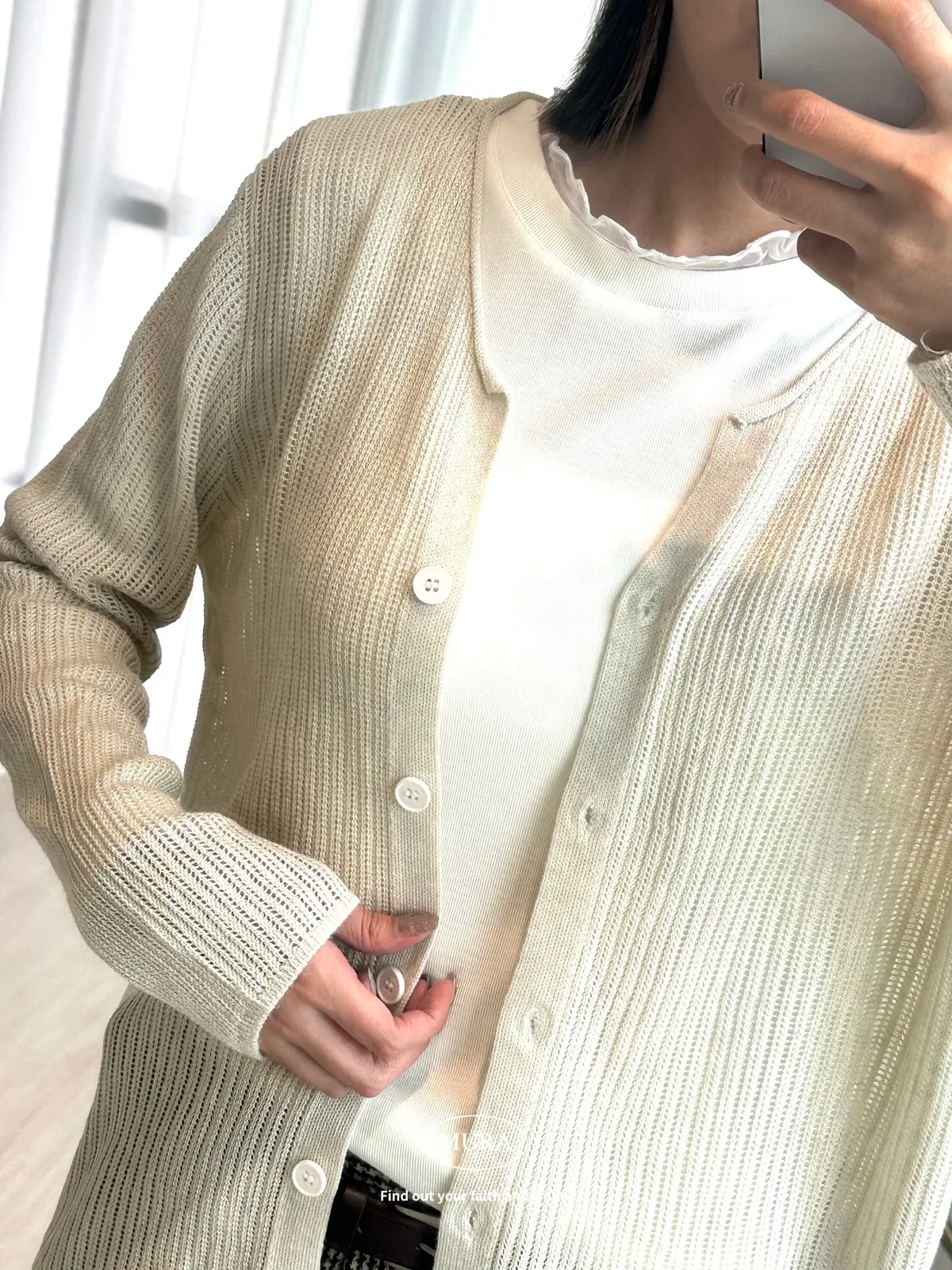 開釦針織外套的小V領剪裁修飾頸部線條,穿上自然散發慵懶氛圍。