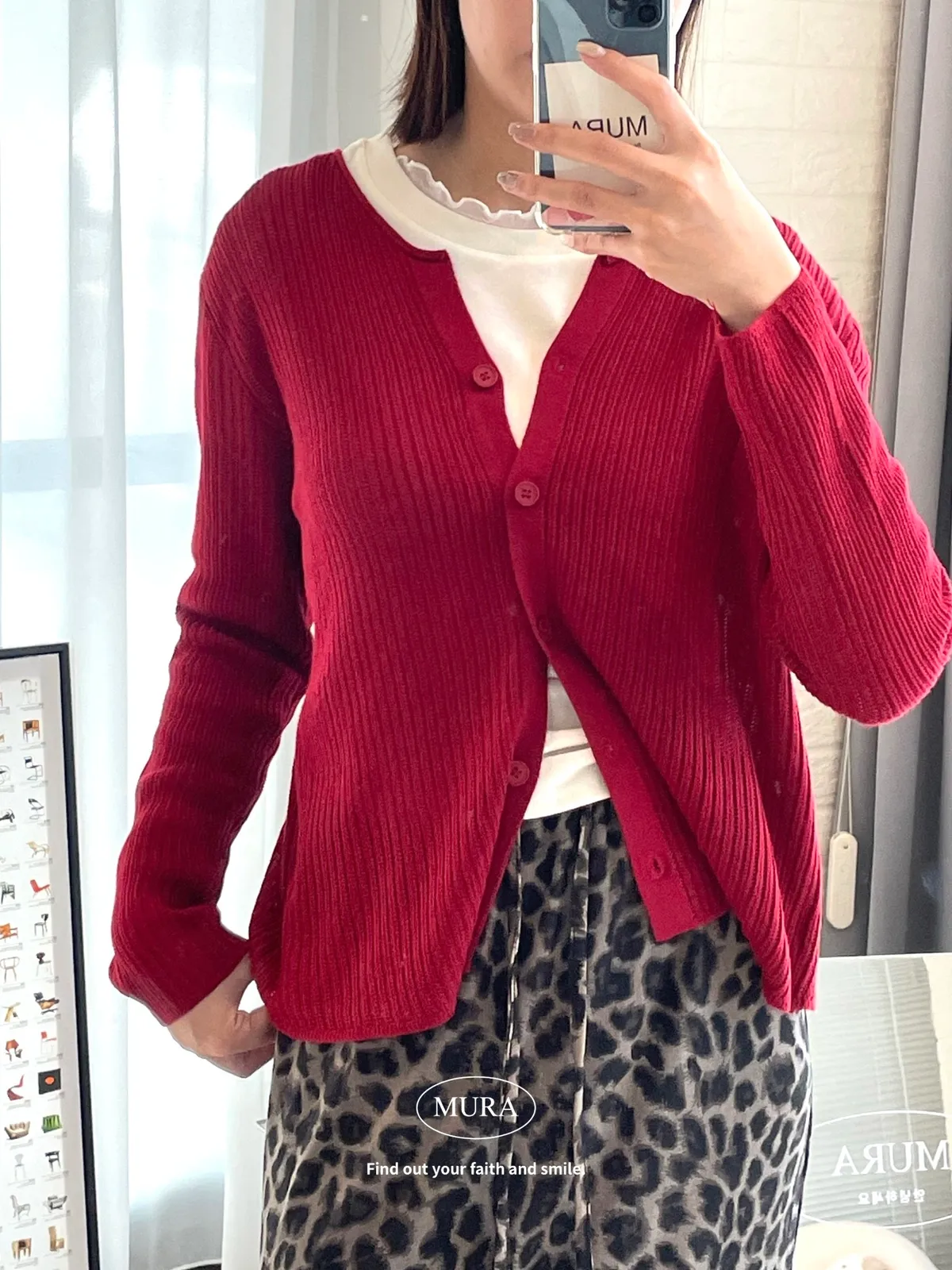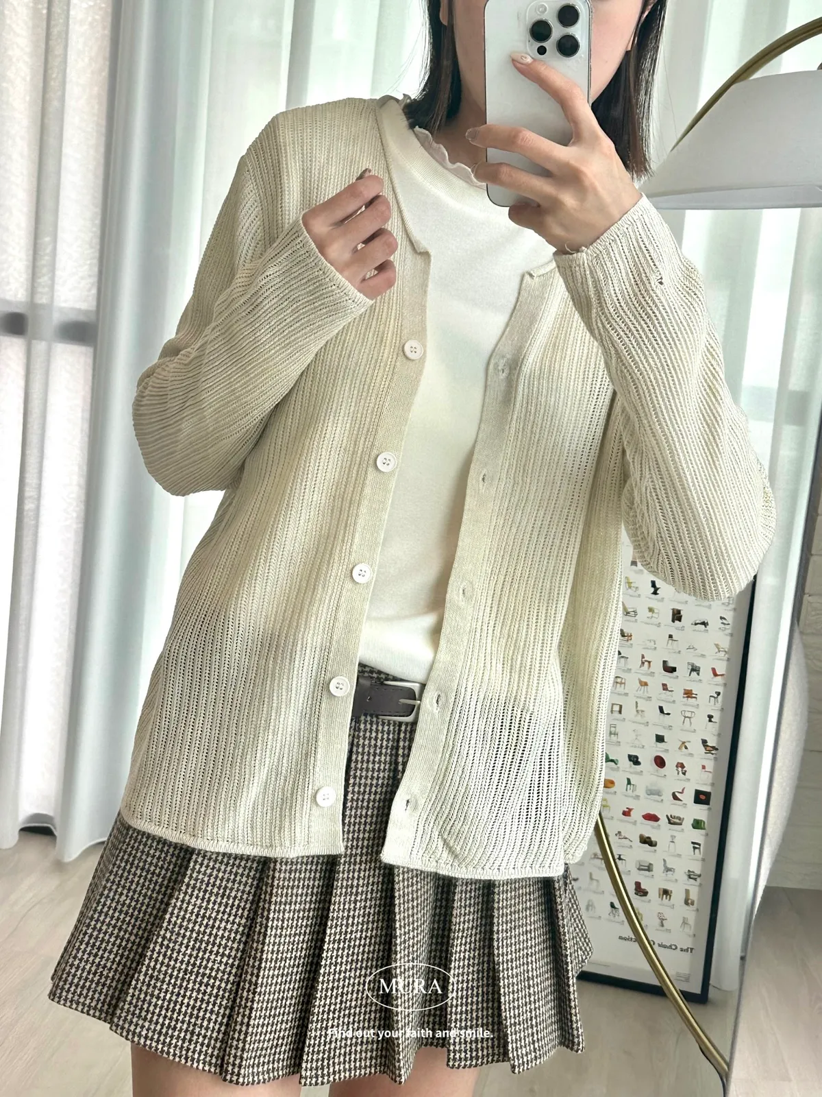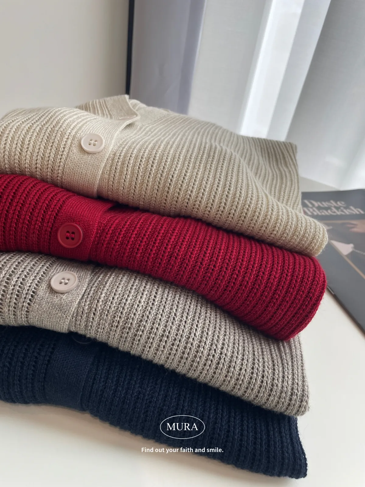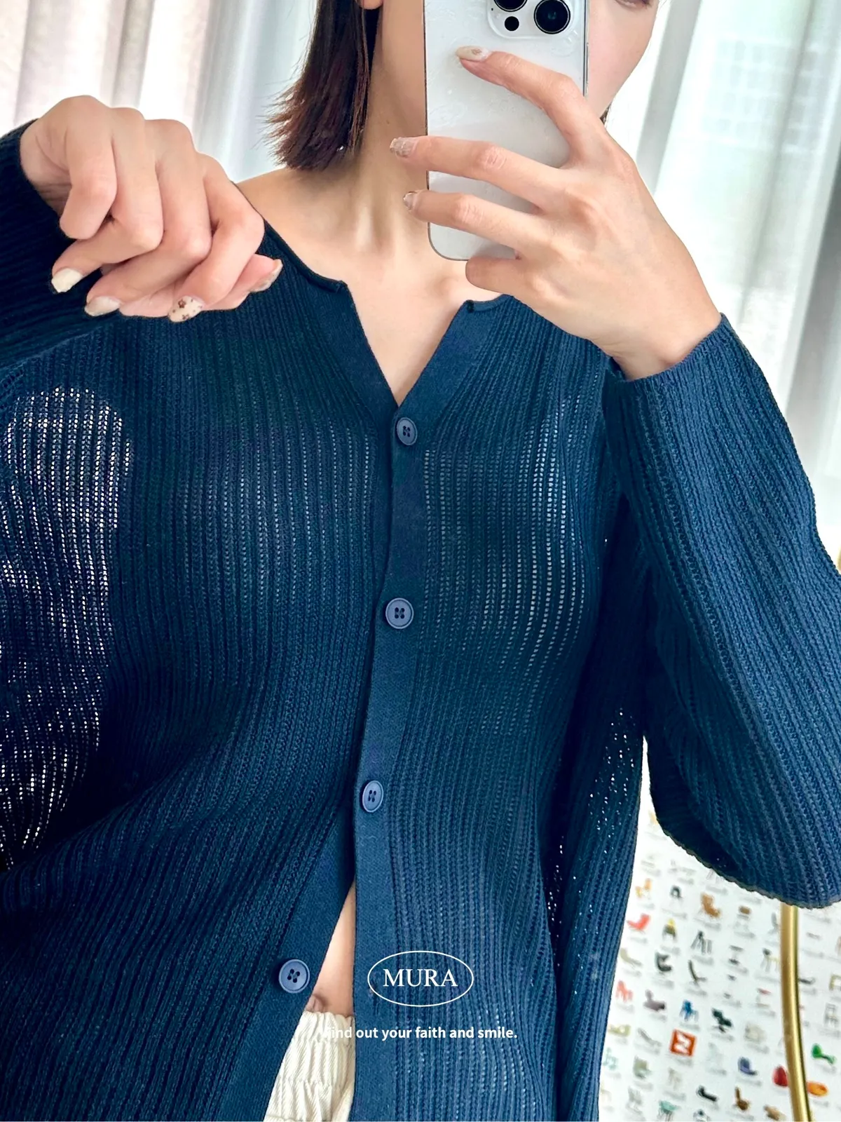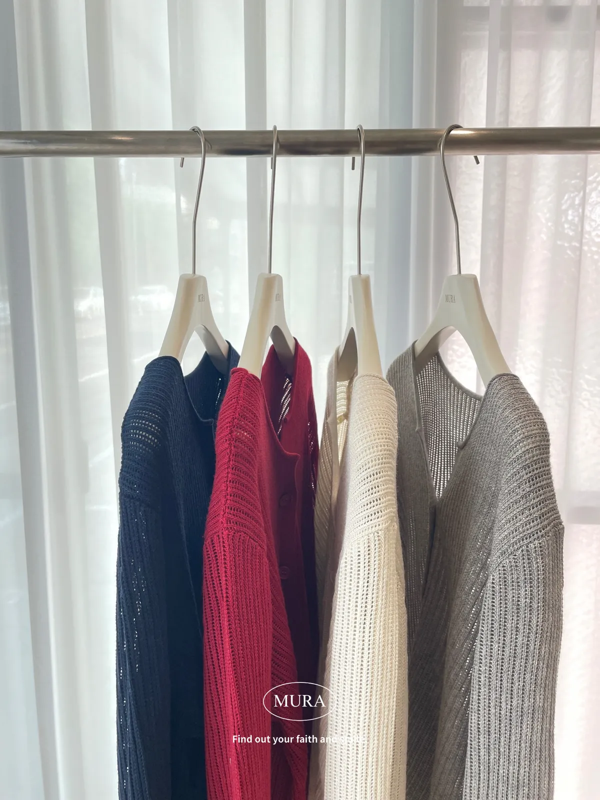 開釦針織外套的小V領剪裁修飾頸部線條,穿上自然散發慵懶氛圍。