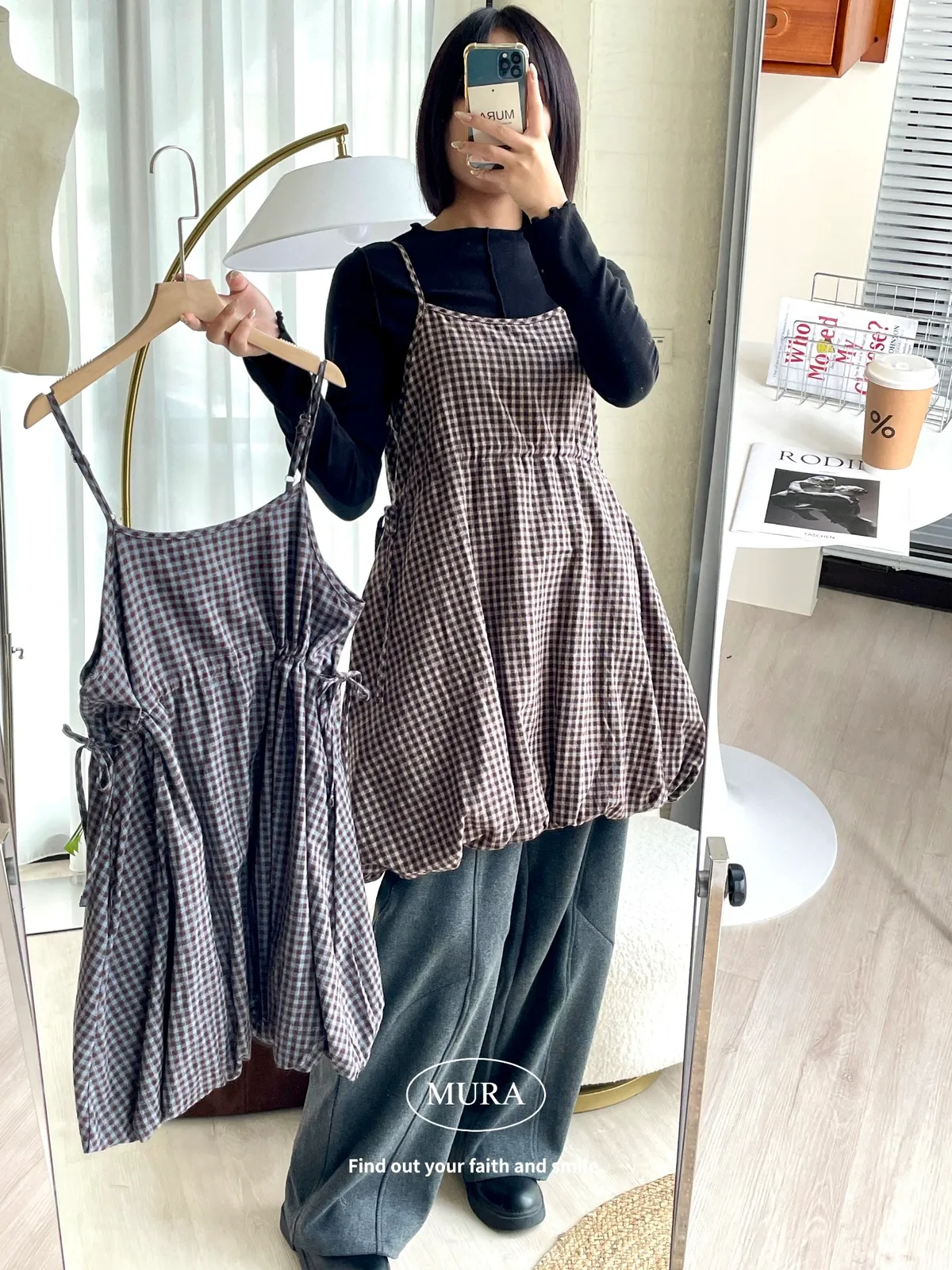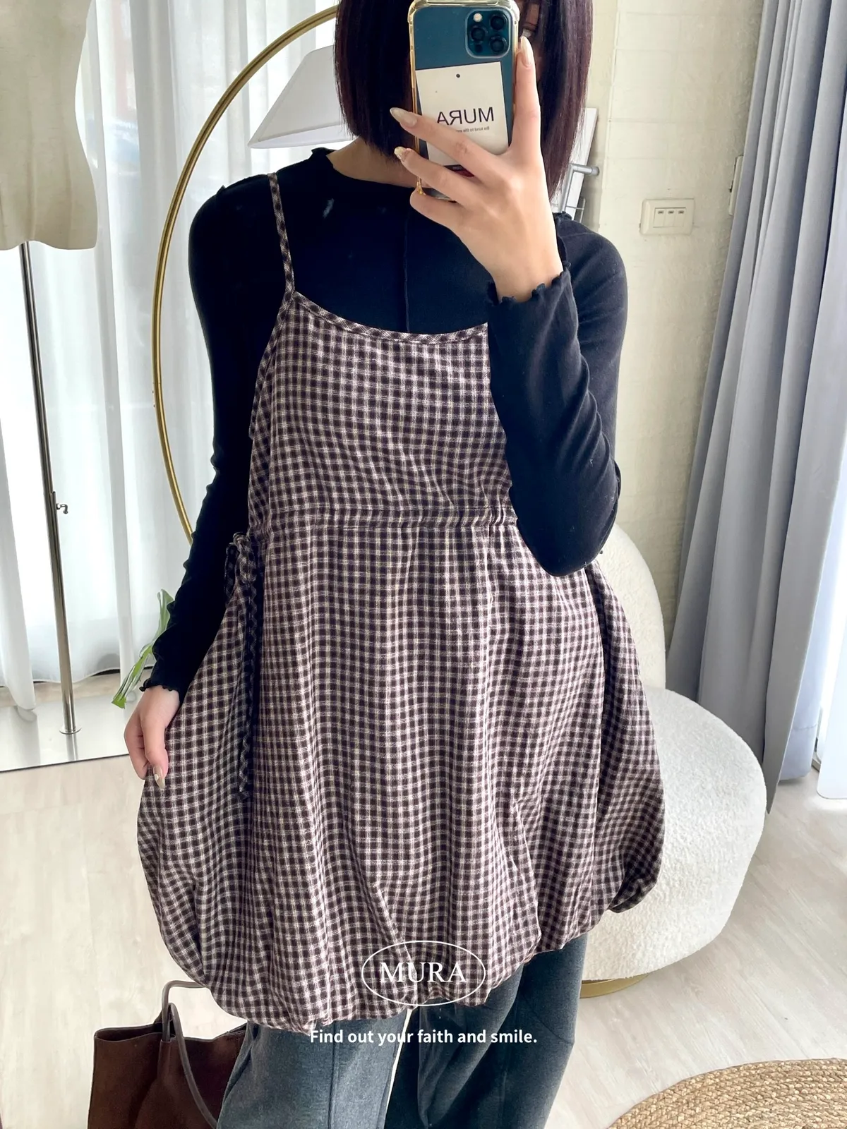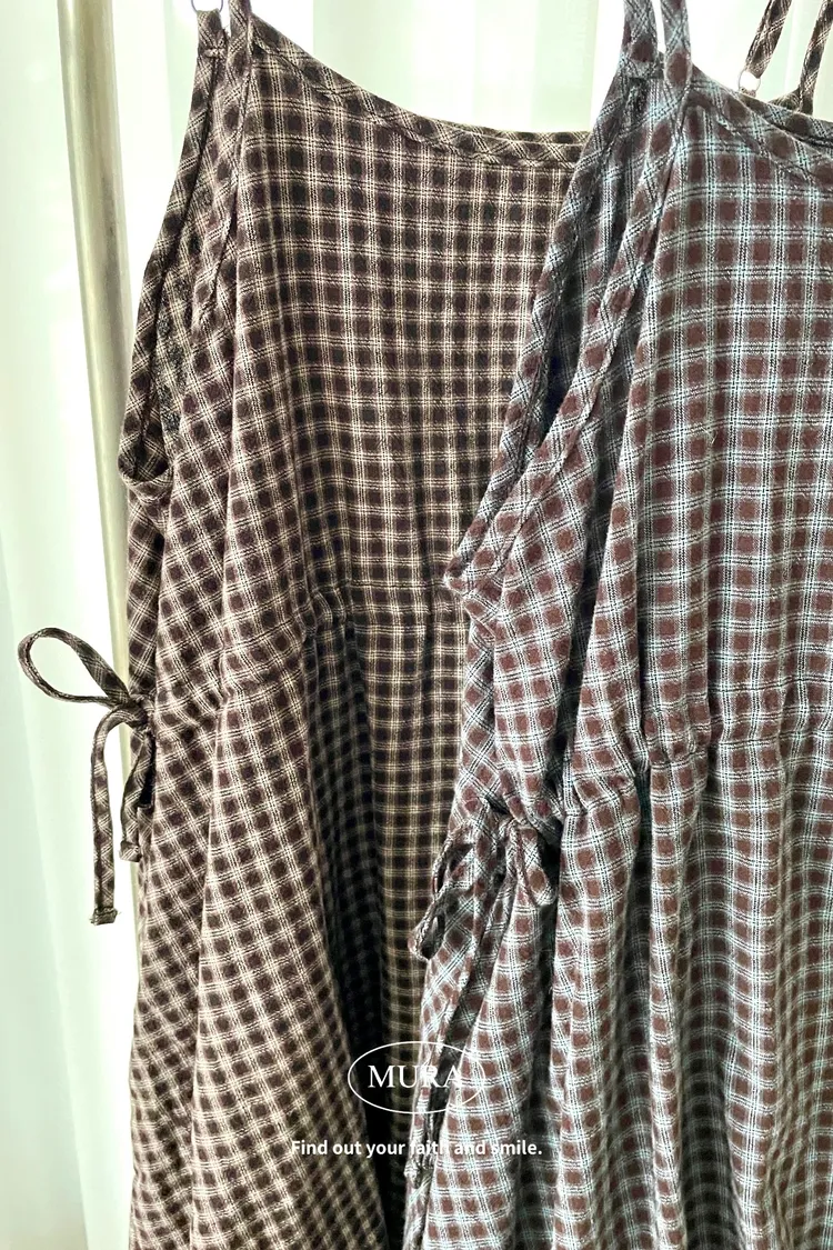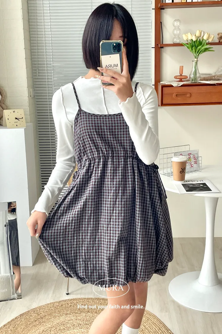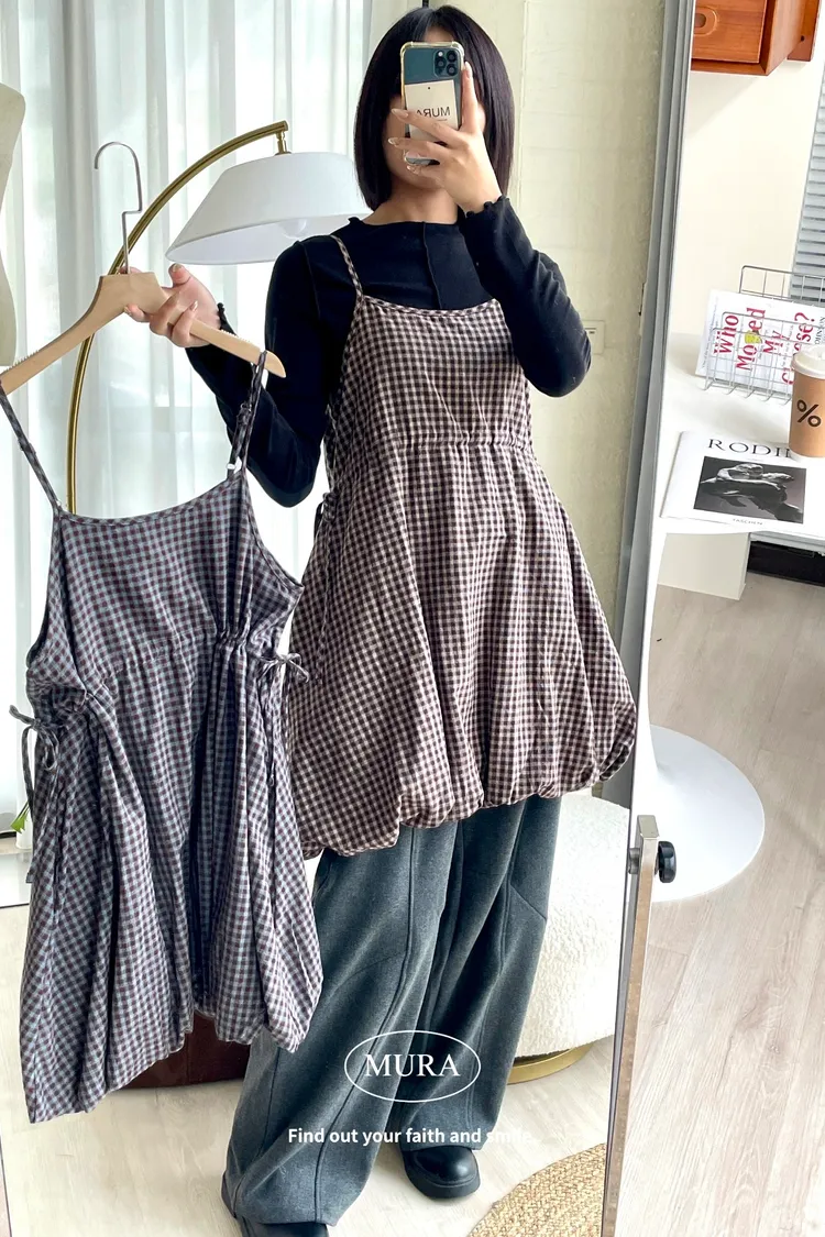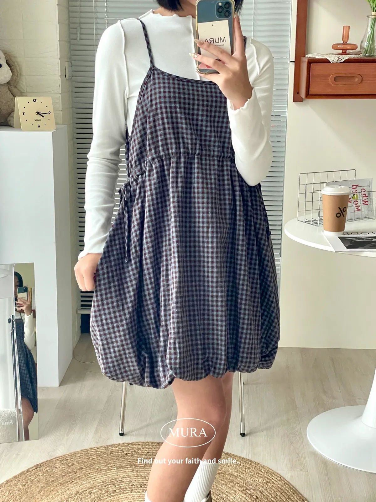 日系氛圍 細格紋花苞吊帶短洋2colors