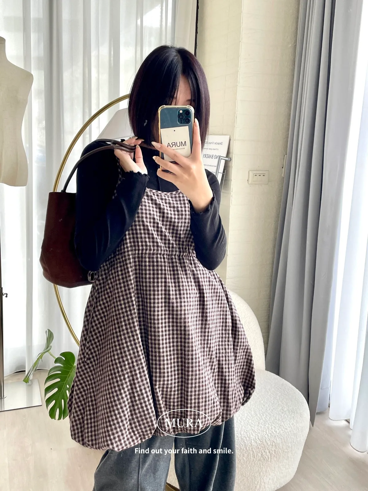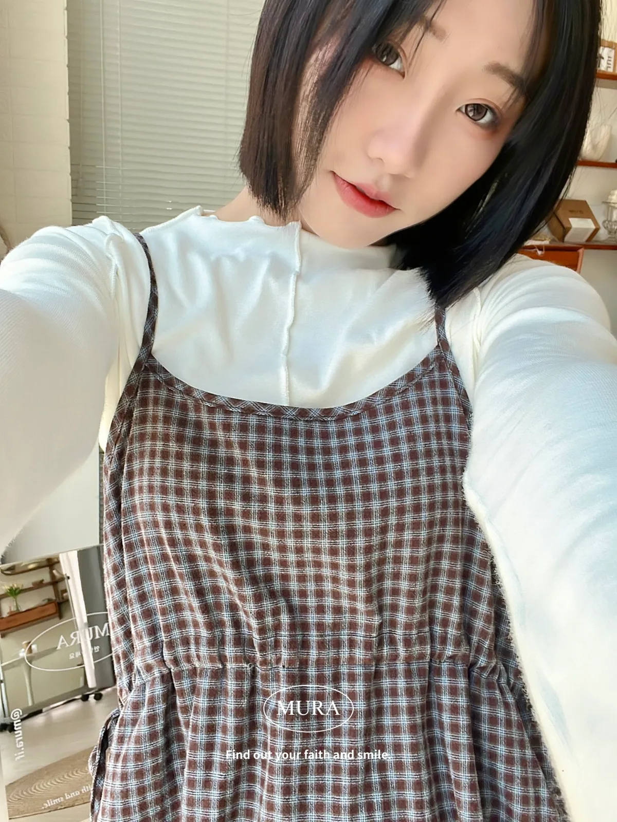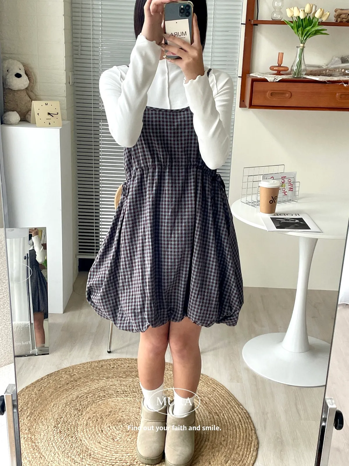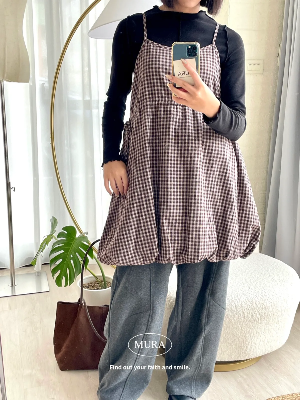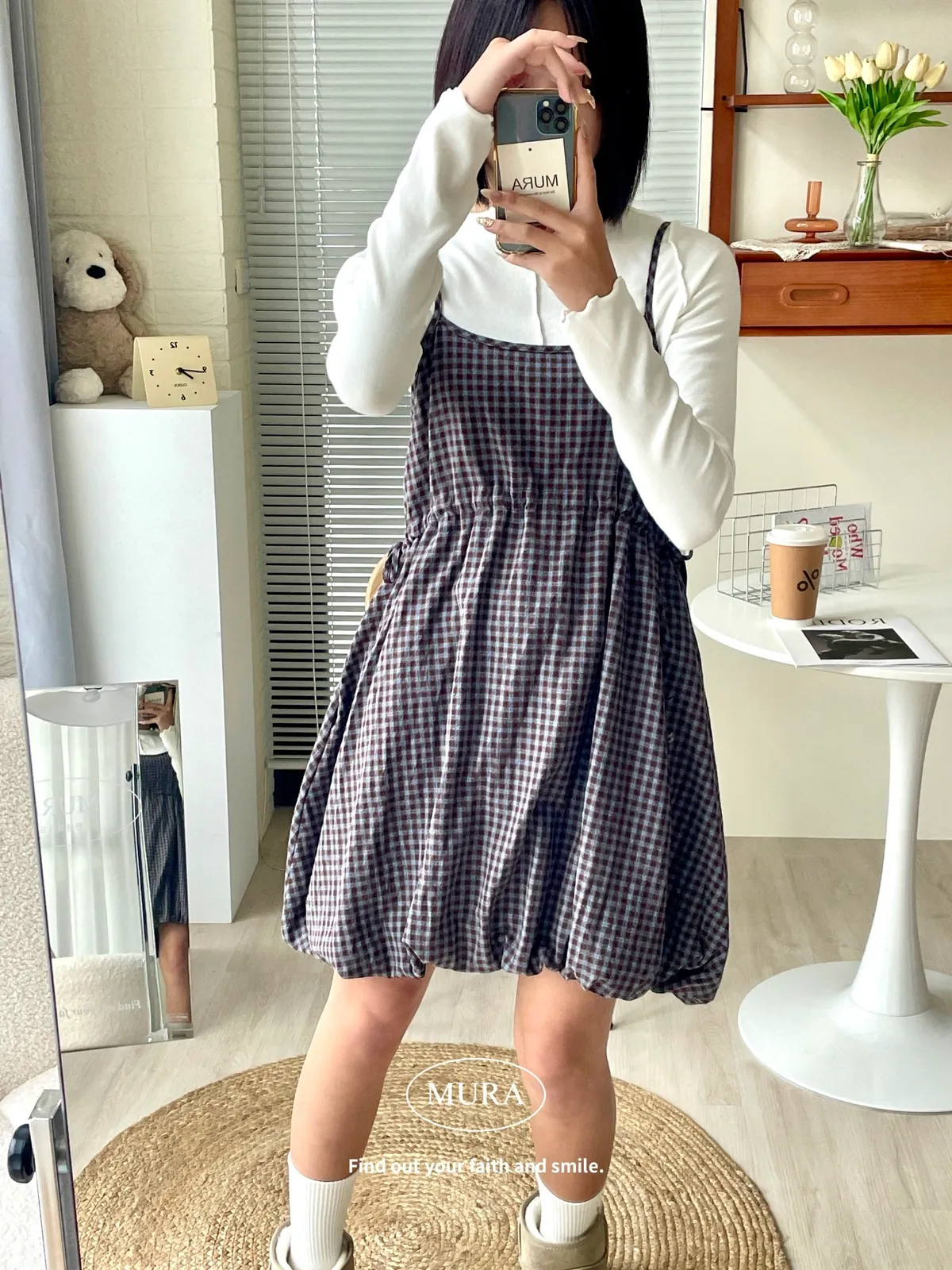 日系氛圍 細格紋花苞吊帶短洋2colors
