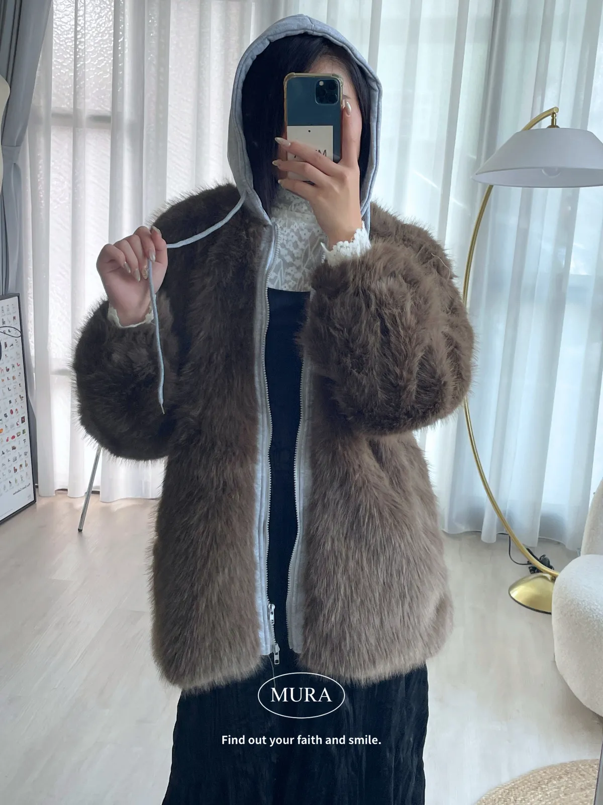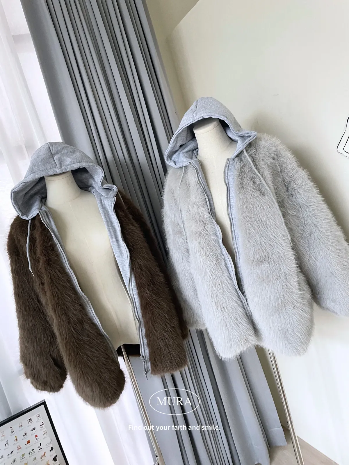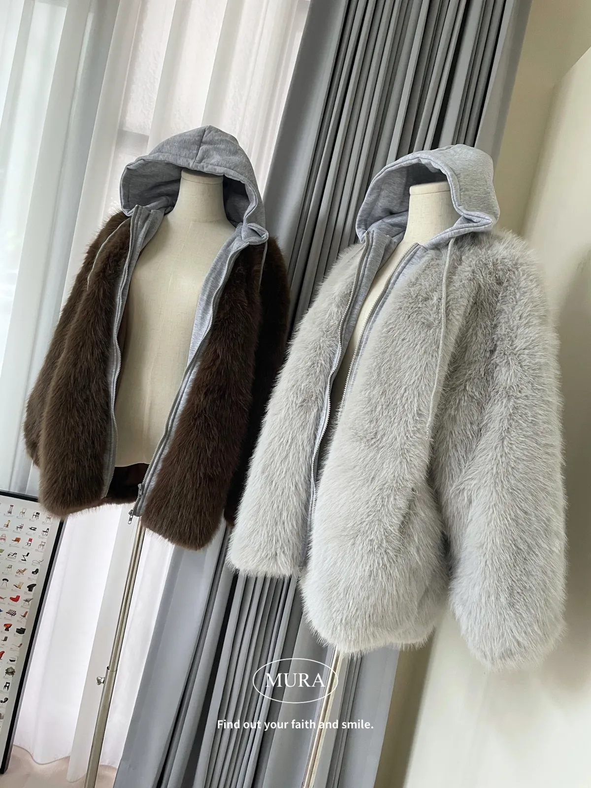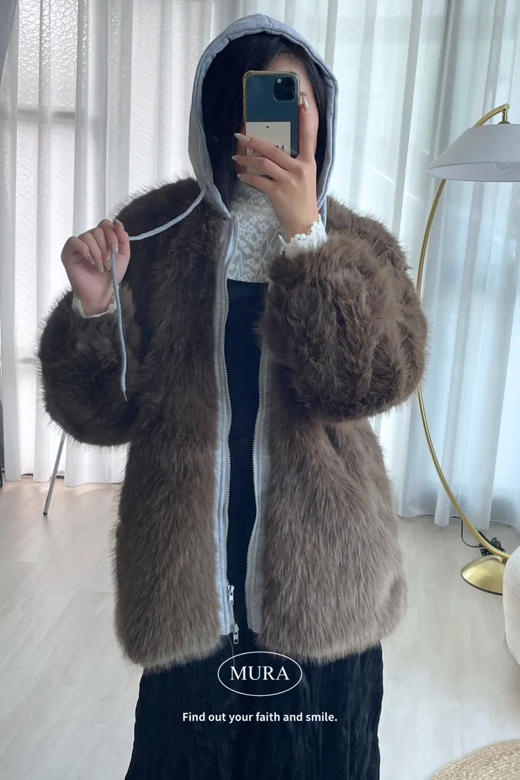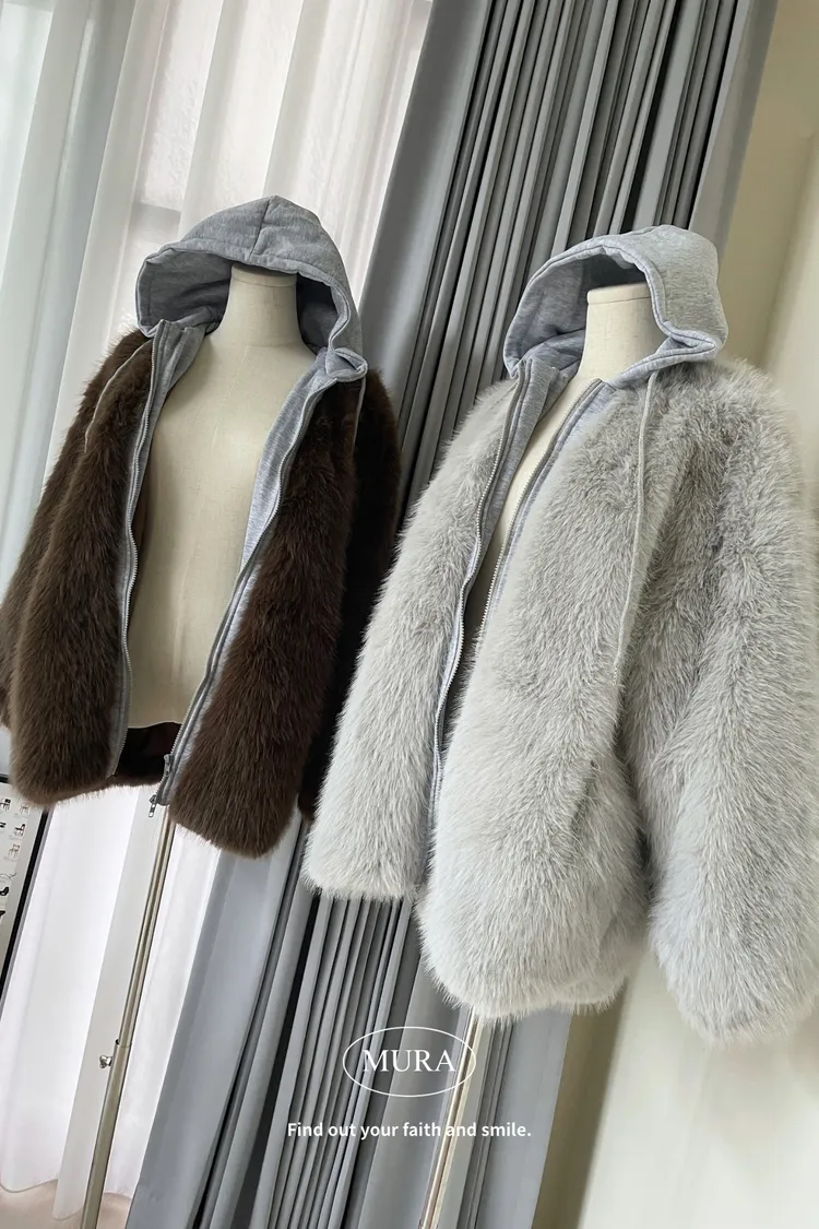 可愛與溫暖並存 毛毛拼接連帽雙拉鍊外套2colors