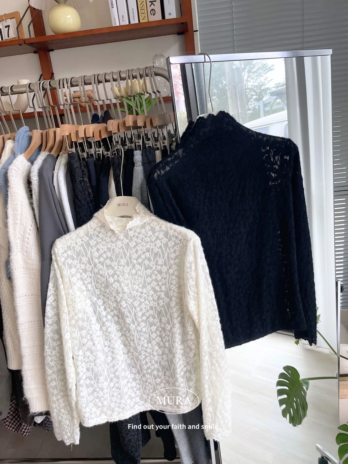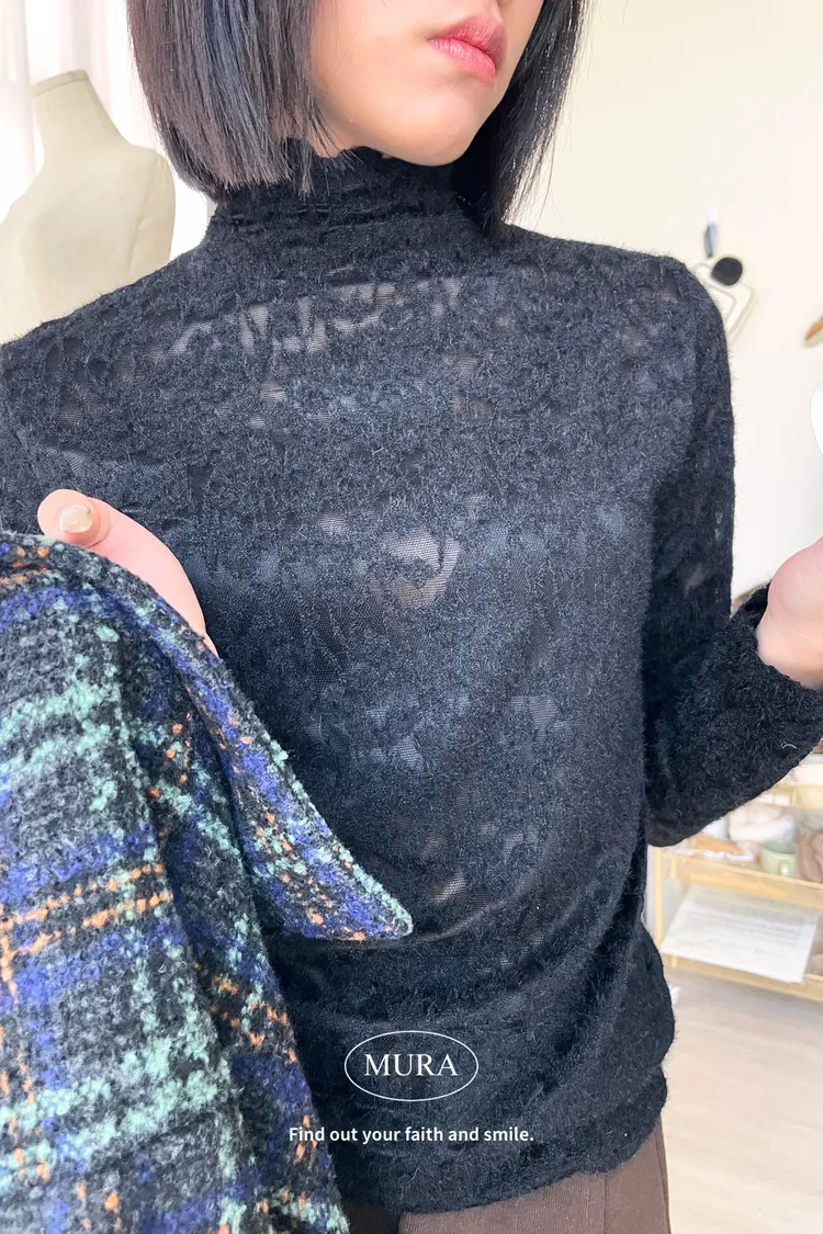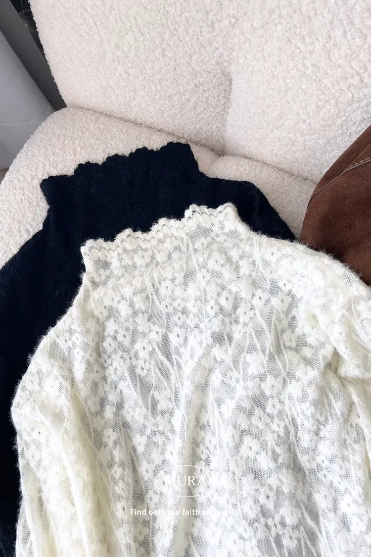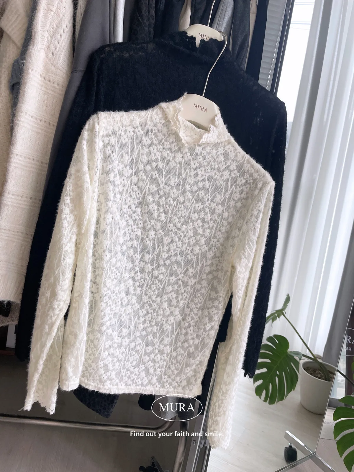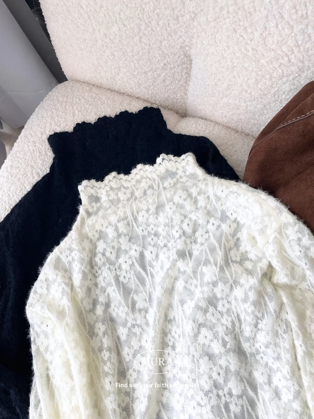不張揚的點綴 絨感蕾絲小花微高領上衣2colors