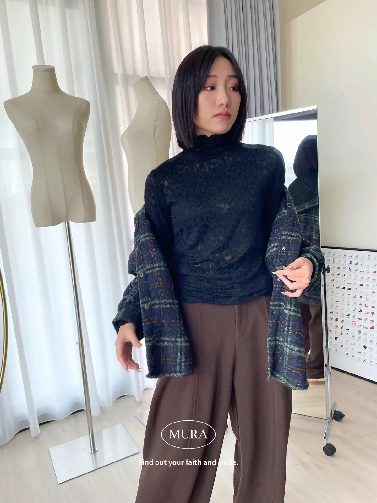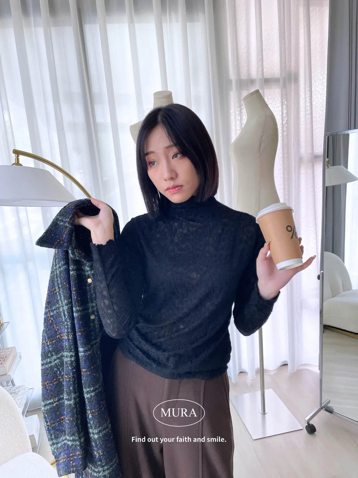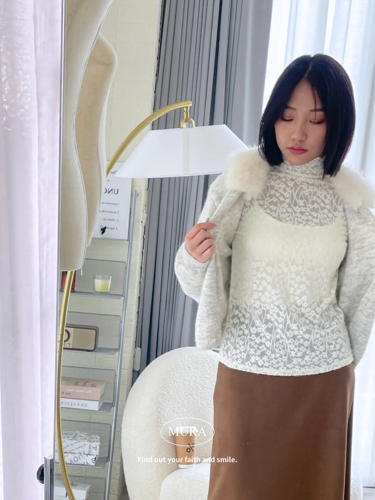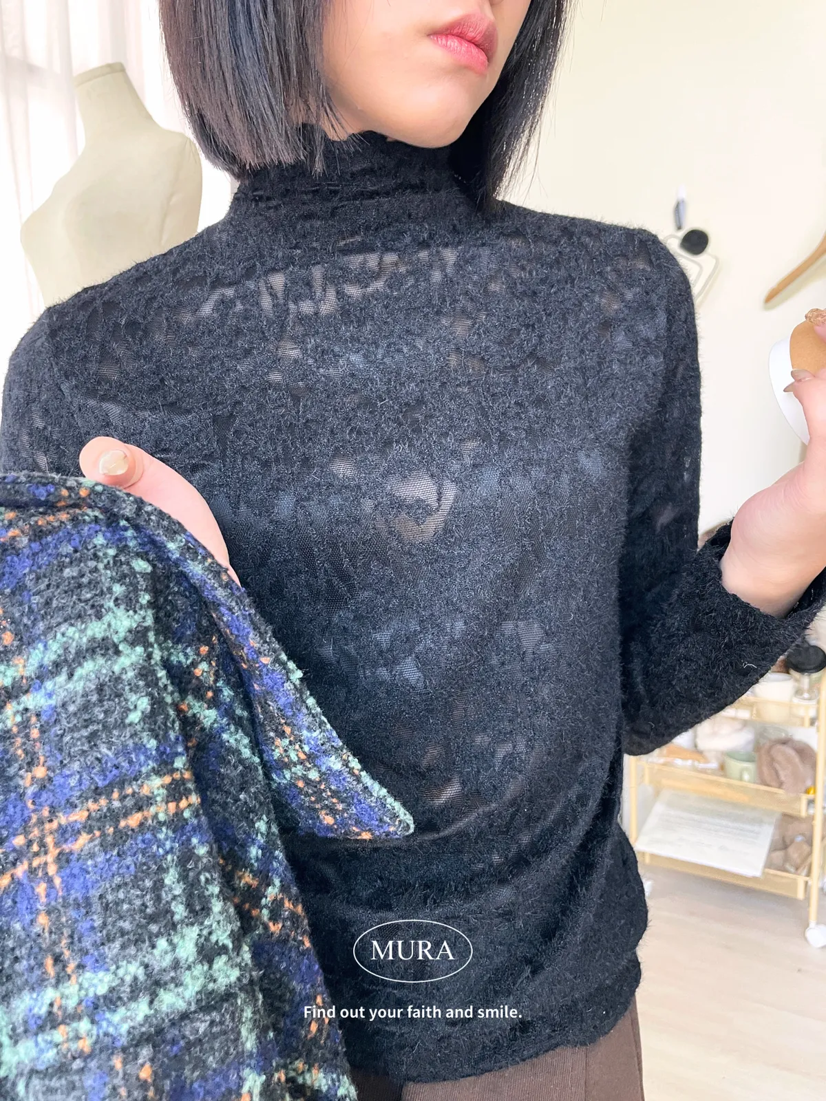 不張揚的點綴 絨感蕾絲小花微高領上衣2colors